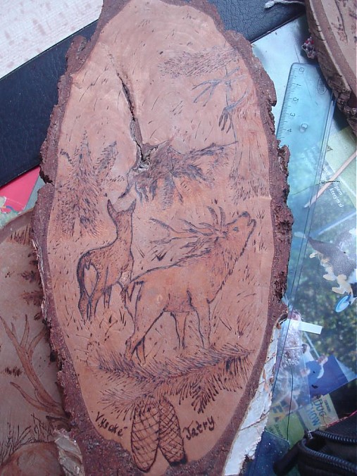 V strede obrázku je kaz v dreve zakomponovaný do obrazu (peň)